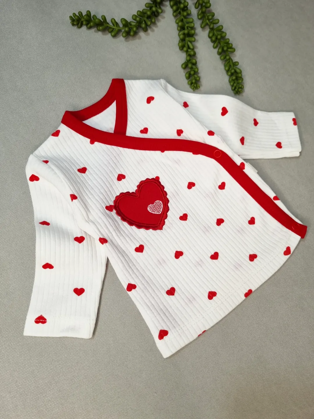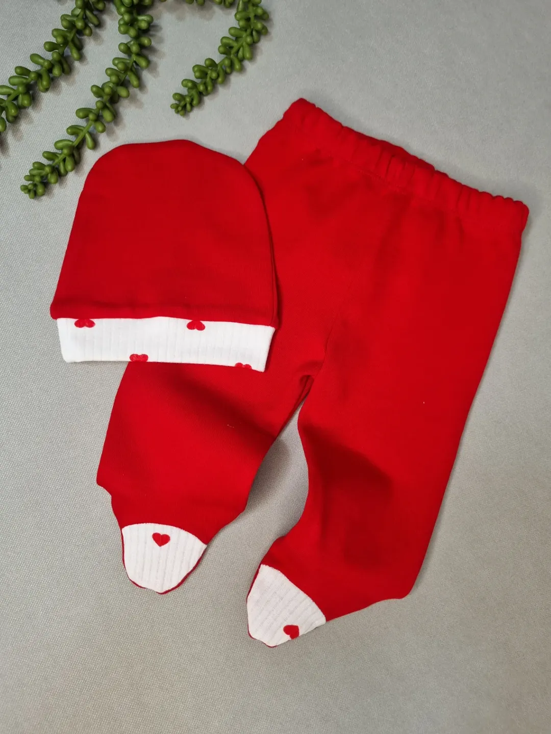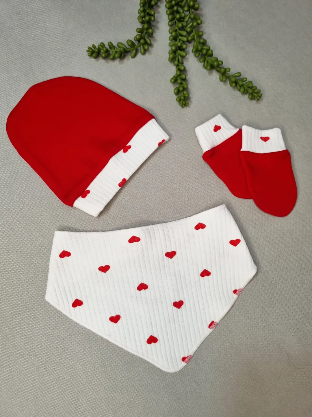 این ست لطیف از نخپنبه ضدحساسیت دوخته شده و برای پوست نوزاد کاملاً ایمنه. رنگبندی آروم و مدل قلبیِ جذابش باعث میشه برای عکسهای اولین روزها و حتی یلدای کوچولوتون عالی باشه.