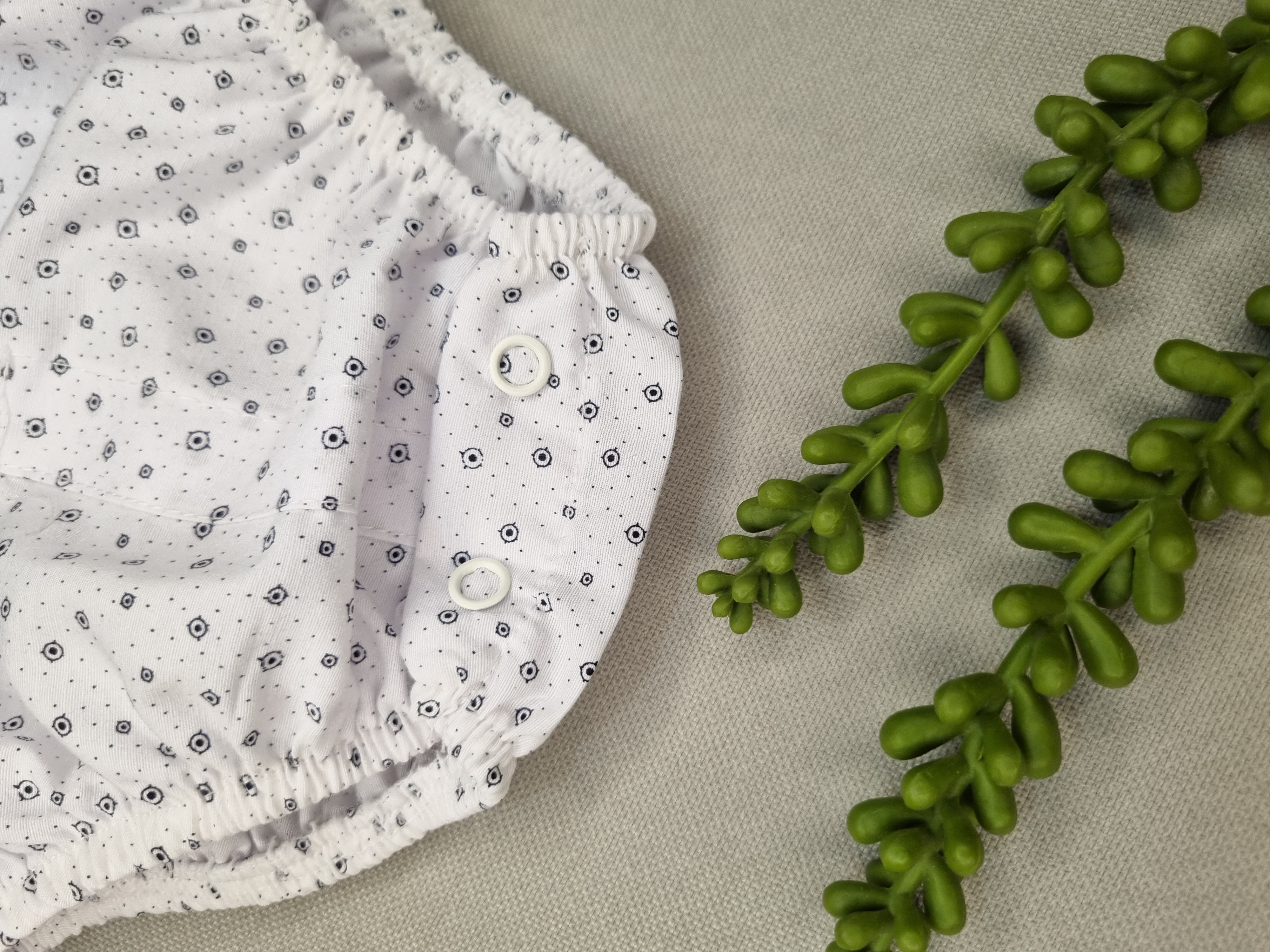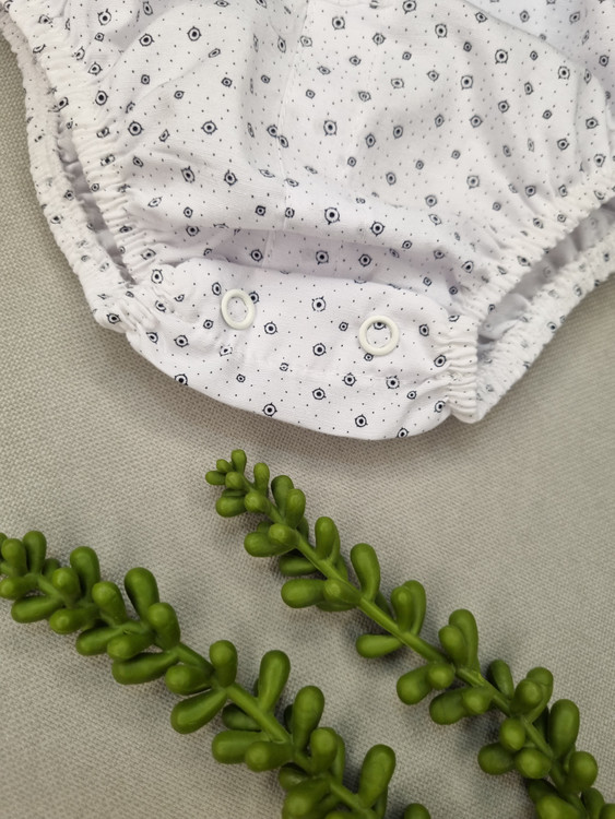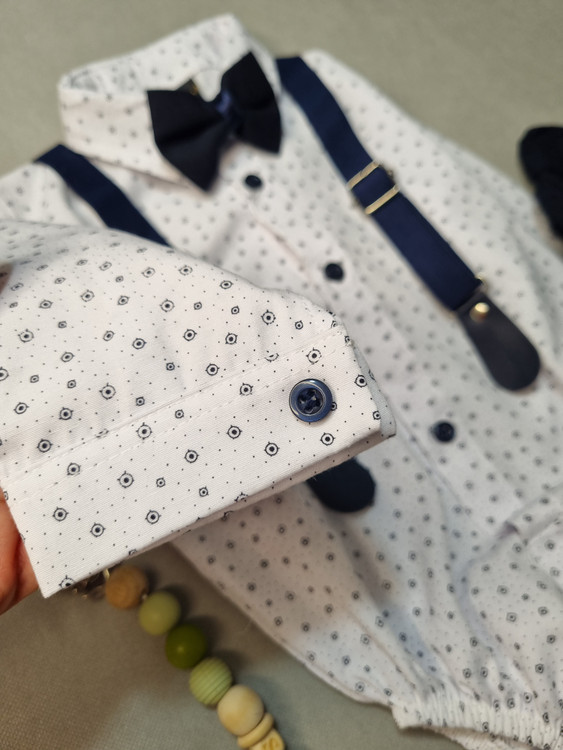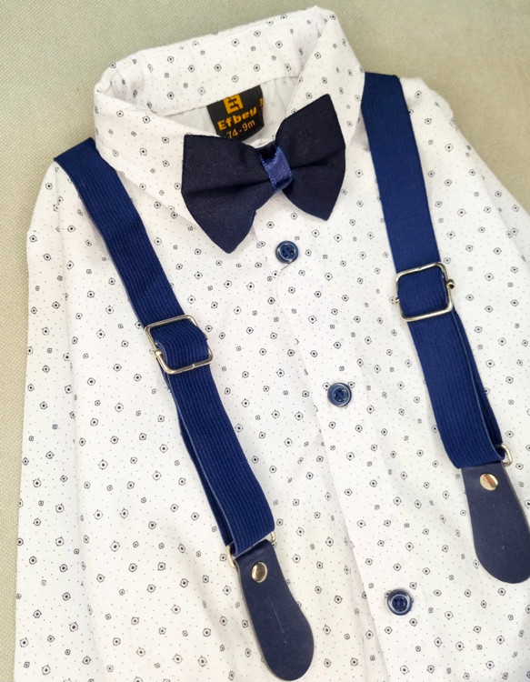 این ست شامل بادی خالدار سفید، شلوار کتان سورمه ای، ساسبند و پاپیون قابل تنظیم هست.